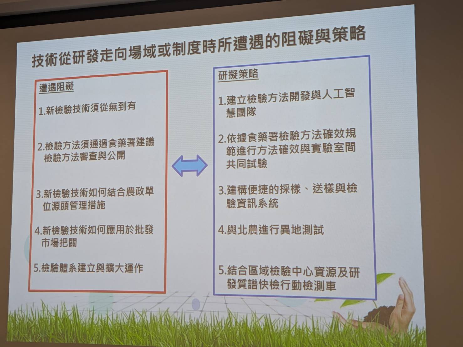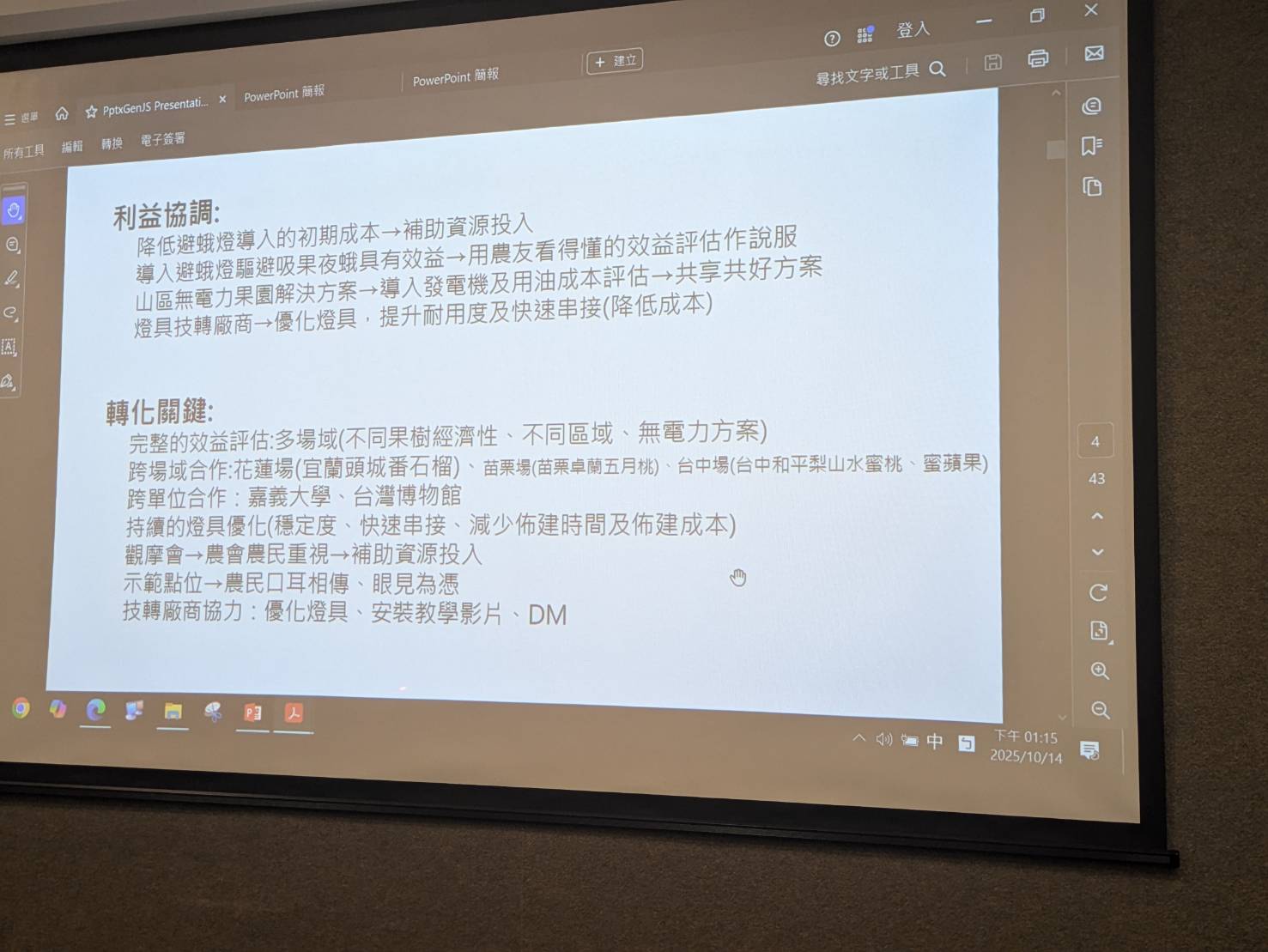 下午場則探討科技成果導入現場的挑戰與轉化。農業部桃園區農業改良場莊國鴻副研究員以「旋轉式避蛾燈」展示物理防治成效,藉共享用電與成本分攤推動農友採用,使吸果夜蛾危害率顯著下降。農業部農業藥物試驗所林韶凱組長介紹「質譜快檢技術」,運用快速萃取與 AI 雲端分析,將農藥檢驗時間由七天縮短至二十五分鐘,並結合市場源頭管理,讓安全農產品平均加值兩成。工業技術研究院楊思源組長則從技術移轉策略出發,強調專利佈局與市場導向思維,促使科研成果有效轉化為產業能量。