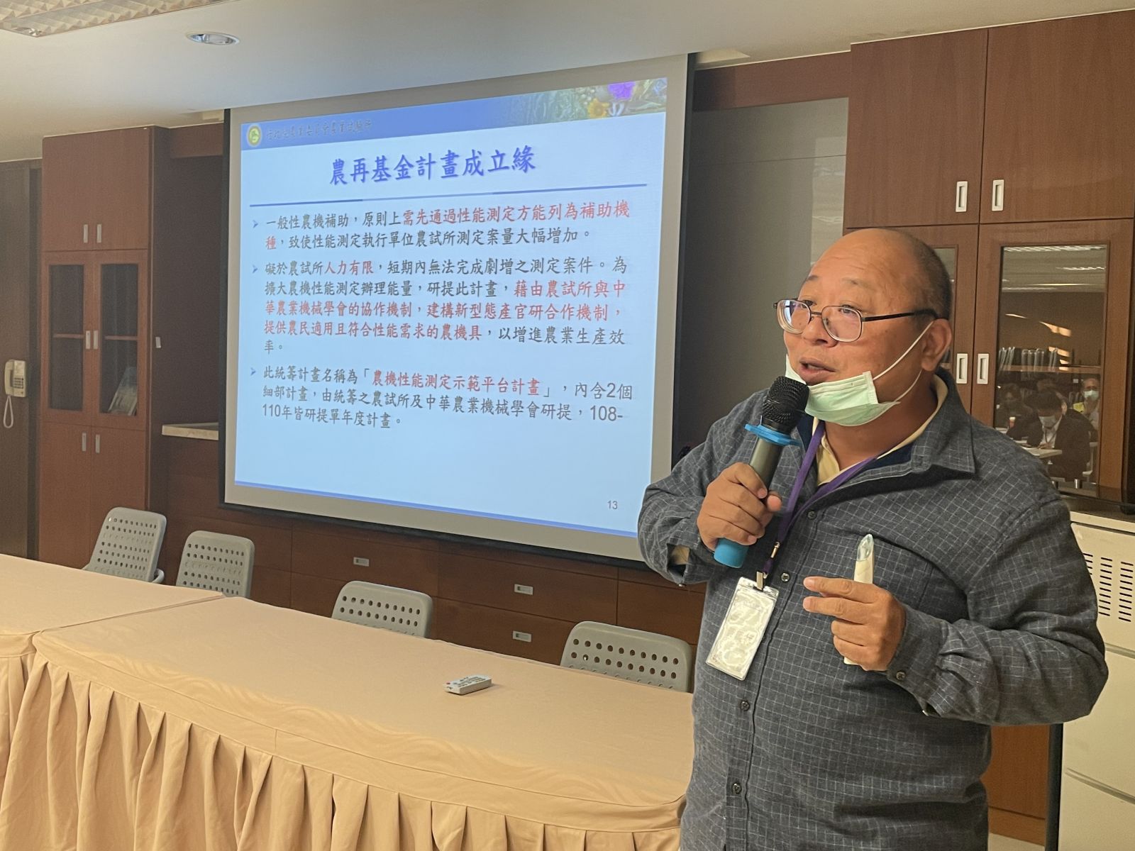 農業試驗所黃國祥研究員(左)簡介「國內外農機性能測定現況及未來」;