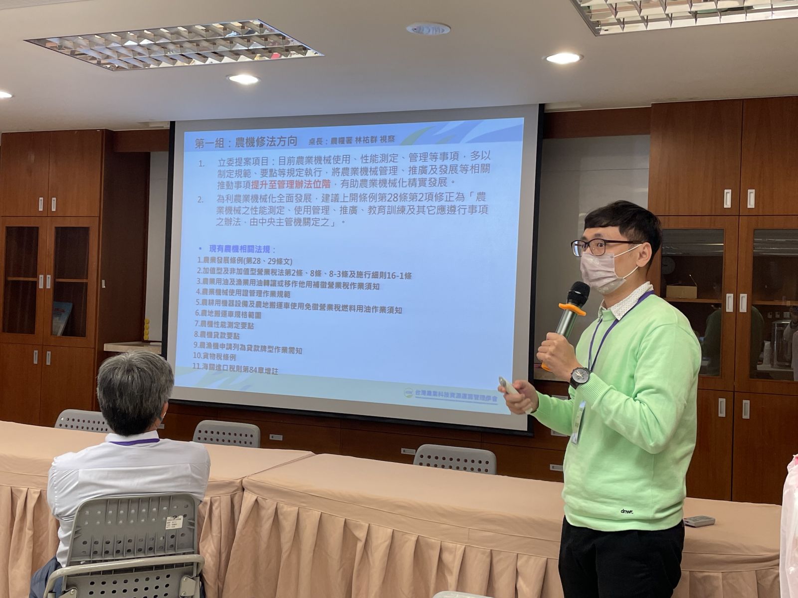 第二日策略工作坊中,第一組以「農機修法方向」為討論主軸,並由桌長農糧署林祐群視察報告成果