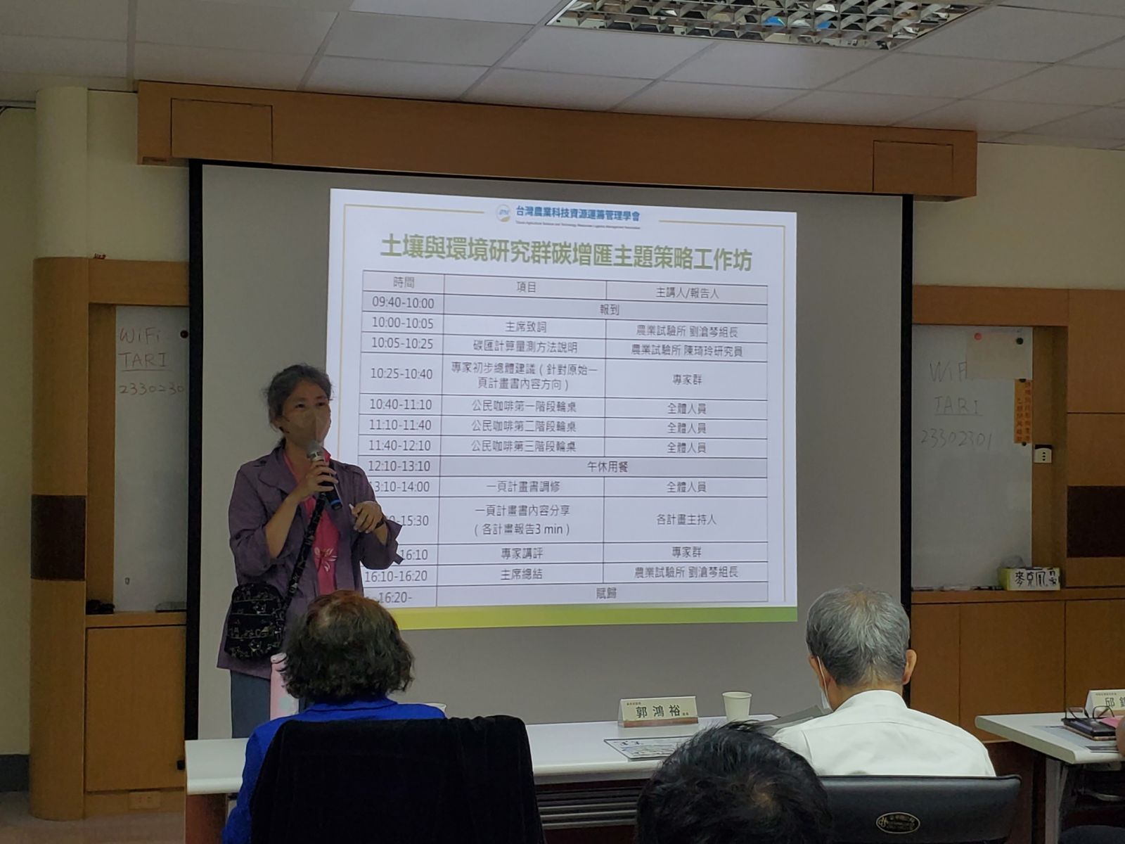 (左)農業試驗所劉滄棽組長為工作坊簡介說明流程、(右)農業試驗所陳琦玲研究員簡介碳匯計算量測方法說明