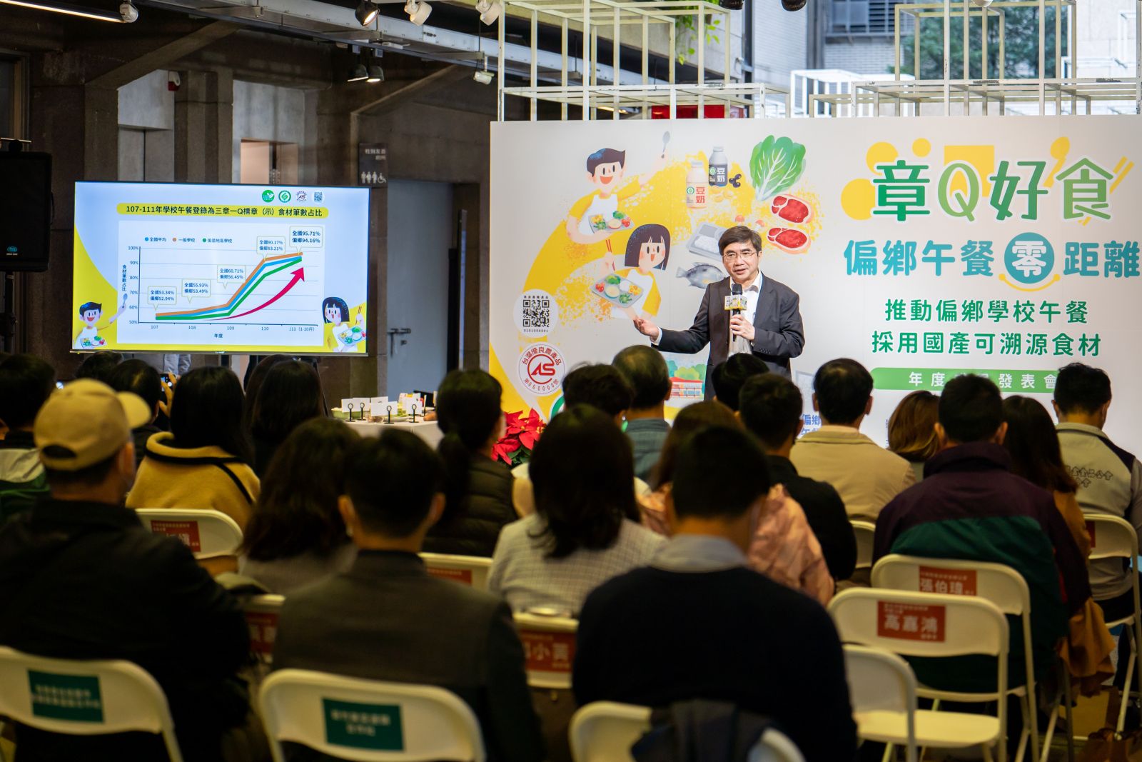 為讓偏鄉學童享有同等之飲食照顧、確保午餐費用主要用於食材採購,行政院農業委員會(簡稱農委會)配合教育部共同推動「偏鄉學校中央廚房計畫」,為宣傳推廣成果,農委會委託本學會於111年12月16日假臺北社會創新實驗中心舉辦「章Q好食,偏鄉午餐零距離─推動偏鄉學校午餐採用國產可溯源食材年度成果發表會」,同時邀請到農委會農糧署陳啓榮主任祕書、行政院食品安全辦公室許輔主任、教育部國民及學前教育署黃瀞儀組長、漁業署繆自昌主任秘書、畜牧處施愛燕科長、農糧署各區分署、餐盒公會陳明信理事長以及偏鄉食材供應平臺等貴賓共襄盛舉。本次活動將推動偏鄉午餐三章一Q標章(示)食材歷程、輔導建置或改善偏鄉食材供應平臺推動情形以及透過多元管道輔導食材媒合對接成果等對外發表,期盼提升利害關係人了解及關注採用國產可溯源食材之議題。