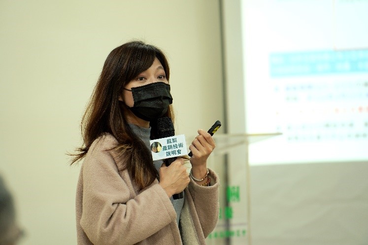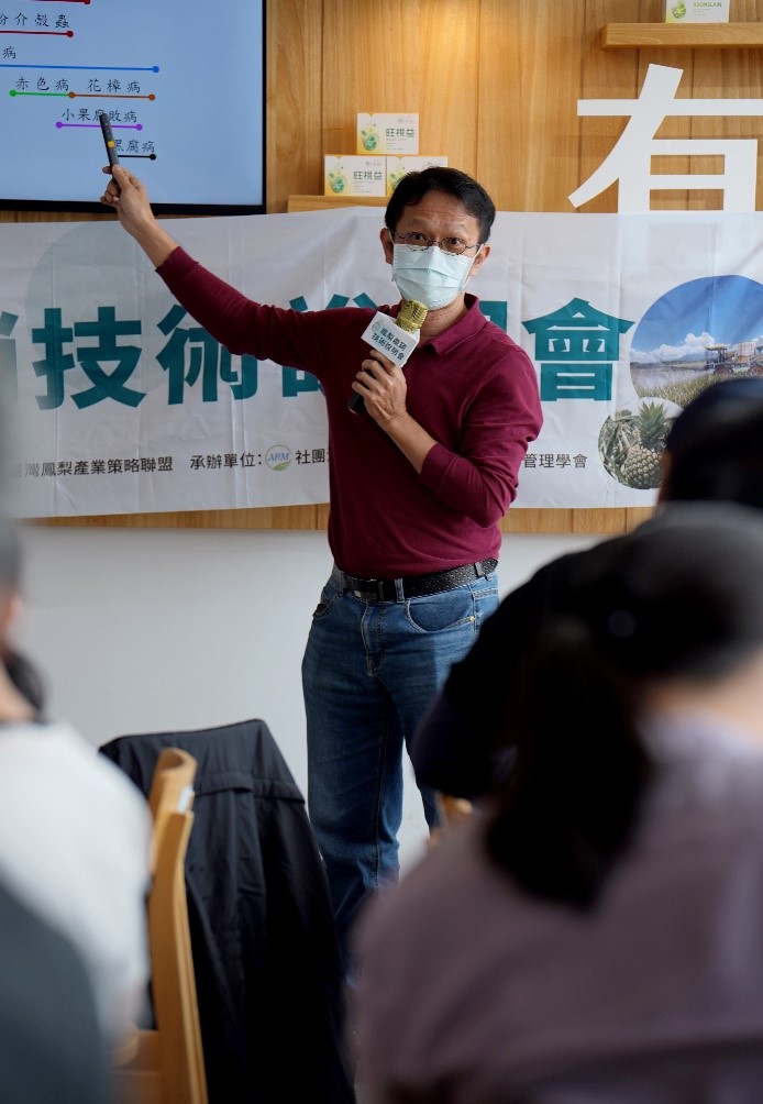 第二階段則針對鳳梨肥培管理、病蟲害防治、銷日鳳梨採後處理與集貨場包裝改善升級進行技術說明分享,分別邀請到農試所陳柱中副研究員與徐武煥副研究員、嘉義分所黃守宏副研究員與唐佳惠助理研究員分享,針對產業個階段不同問題點提出建議與看法,提供鳳梨生產者整合式輔導服務資訊,包含如產期和產量預測、種植期間各階段病蟲害防治注意事項、採後處理作業重要環節、包裝場設施(備)改善方法等,並向與會來賓說明農試所將持續投入研究人力進行技術及設施(備)開發,提供全方位問題解決方案,協助鳳梨產業升級。