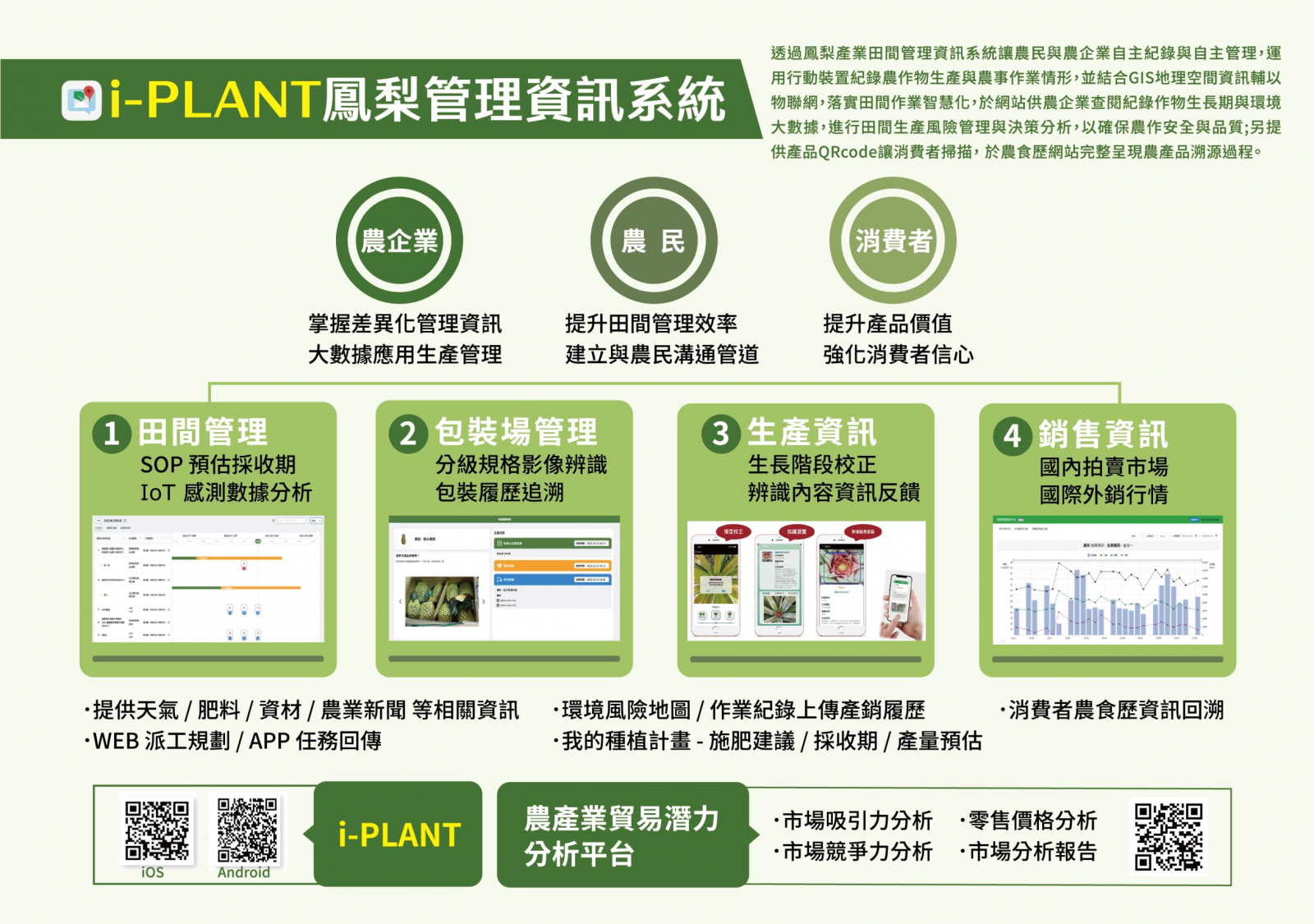 本次參與課程的打貓合作社陳映延主席表示,田間管理資訊系統(i-PLANT)系統可輸入催花時間,系統內根據日照、溫度資訊,能推估成熟期及產量,事先向各通路、客戶告知,安排促銷或銷售空間,若有空窗期,也能安排其他水果上架,將會對農民在外銷通路上有極大幫助。本次活動預計在7月再辦理一場次產地鳳梨產銷技術說明會,將依據本次說明會與會農友提及的需求,導入省工機械化與設備現代化多元的課程,提供鳳梨產業鏈各個環節分工角色專業知識,增加供應鏈優質與安全鳳梨產品,讓產業夥伴安心開拓外銷市場。