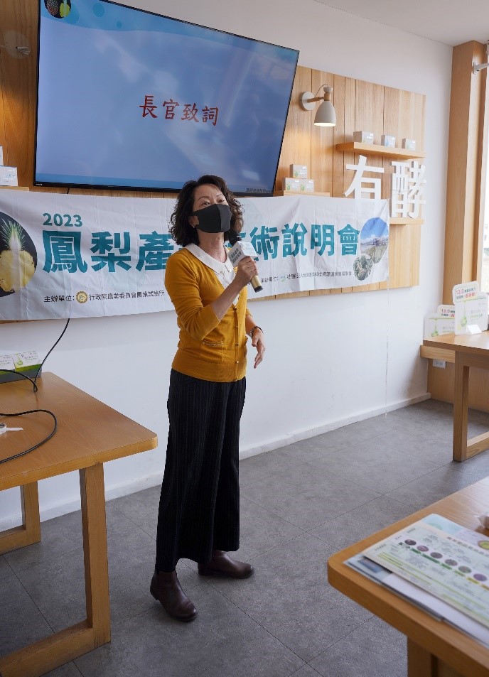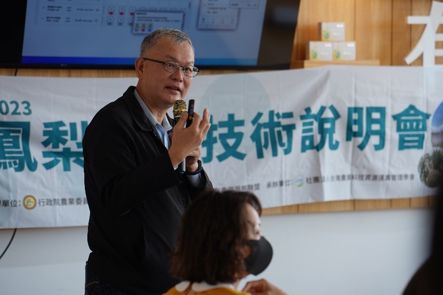 林學詩所長致詞時表示,鳳梨為本所嘉義分所的重點輔導產業,近年更加入總所農業化學組、應用動物組及農業工程組的同仁參與研發,擴大產業服務量能,幫助鳳梨產業更進一步。未來農試所將持續推動田間管理資訊系統(i-PLANT),藉由大數據與雲端資料的串接與運用,整合產銷兩端資訊,提供一站式資訊供鳳梨產業相關人員查詢,包括天氣預報、生產管理、產量預估、銷售安排等,針對預警資訊及預測結果,調節管理技術及採後處理流程,運用創新數位科技,打通鳳梨產業任督二脈,助攻國際市場。