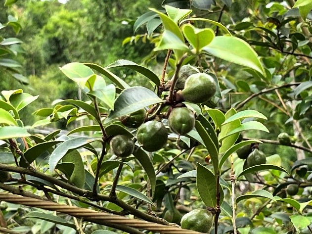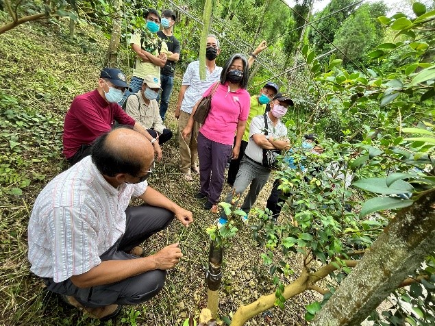 上午由東榮農場蘇光明場長帶領大家至示範田區介紹改良場技轉之豐產品系、岑溪軟枝品系、日本紅花大果油茶等油茶品種,並從中介紹針軟枝與硬枝各品系的樹型修整方式,蘇場長也透過一區老樹林展示成樹的修整方式及透過嫁接改良達到園區豐產的效果。