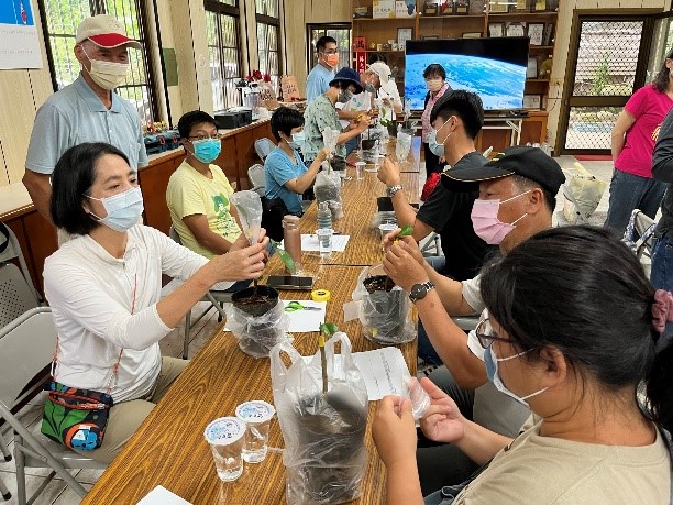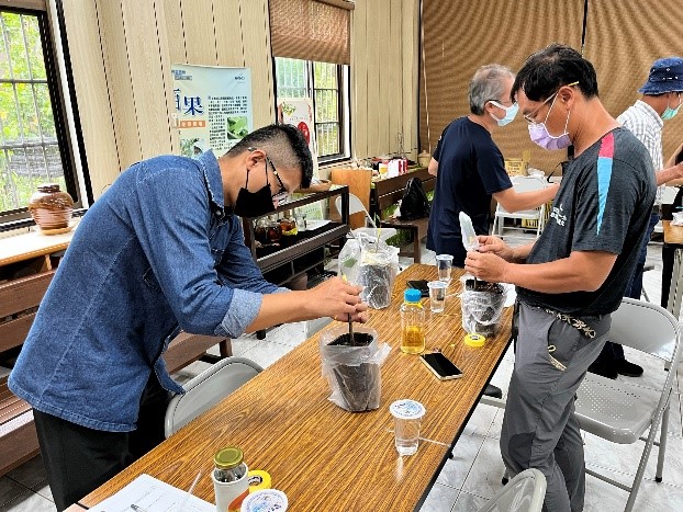下午則由東榮農場蘇惟均先生帶領農友觀摩油茶採後處理機械設備,包括冷藏設備、脫殼機、烘乾設備等設備,透過此設備可有效的提升油茶品質,並大量縮短採收後處理的時間,從原本的25天縮短至5天;最後蘇場長指導學員們進行油茶苗嫁接實作,學員們覺得課程非常務實、受用收益良多!