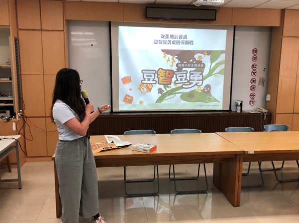 最後介紹台灣農業生產永續利用的議題,介紹大糧倉政策推動的國產大豆為例,說明水稻與雜糧的輪作制度對水資源、減少農藥與化肥使用與糧食自給率的貢獻,為台灣的農業建構一個安全友善的耕作環境。另外,本學會也提供國產陽光豆乳,邀請學生一同品嘗國產雜糧好滋味,並導入「豆智豆勇」桌遊,讓學生們對於大豆的多元加工應用,有更深一步的認識。