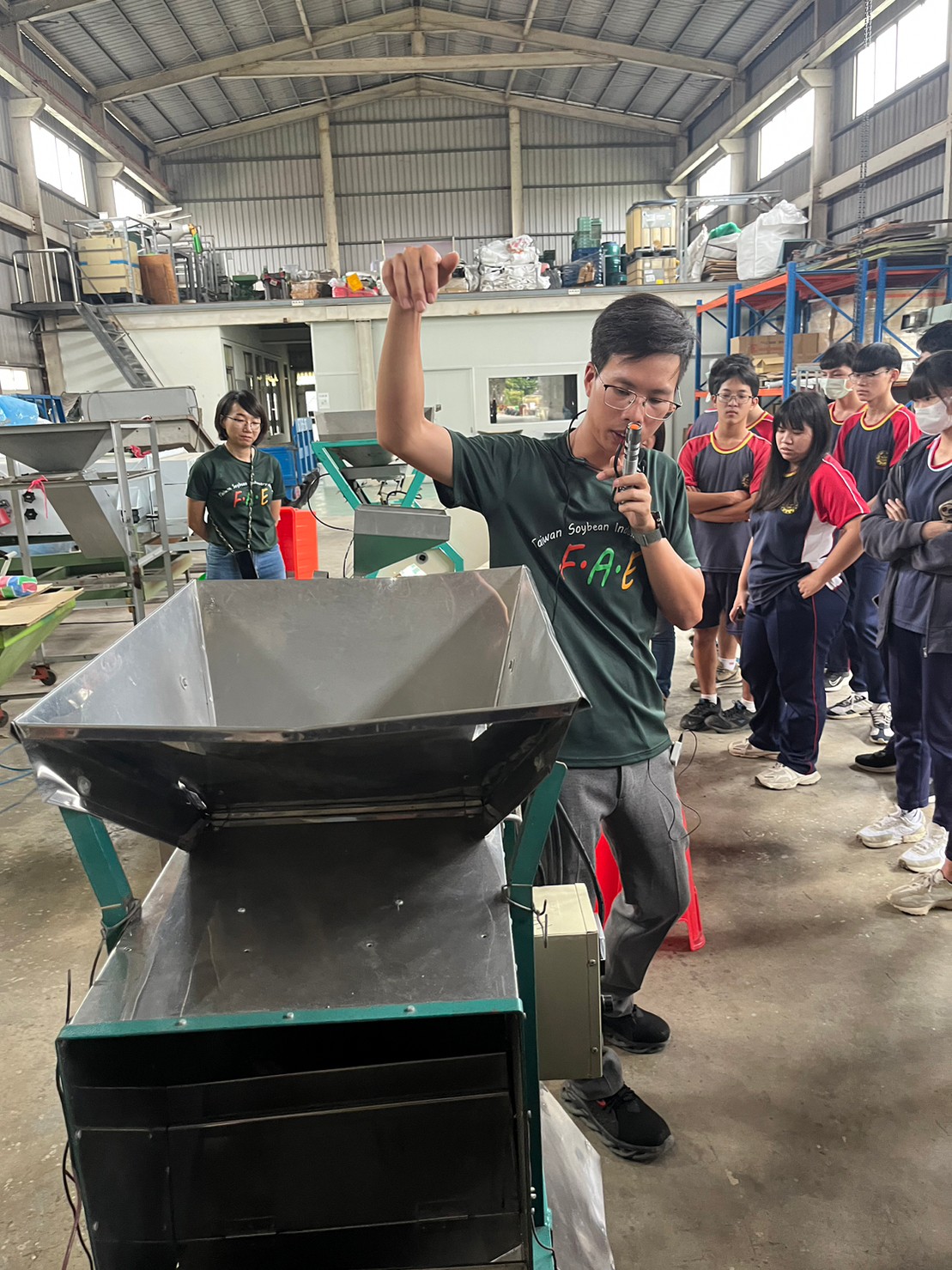 第二站來到「西螺黑豆產銷班」,由黑豆將軍蔡濰揚(以下簡稱小蔡)帶領學生們從田間植物識別入門,開始介紹台灣主要的黑豆及黃豆品系,並讓學生於田間親眼看到黑豆與黃豆於表徵的差異及特色,接著安排完整的黑豆黃豆生產圖運用簡單的解說,讓學生了解所有黑豆的加工製品及後續延伸的產品鏈;接著讓學生學習黑豆於加工製品前所使用的風選機、選別機及色選機,讓學生了解於製作一個完整的產品前需要有多麼繁瑣的工序,才於平日的餐桌上看到美味的黑豆加入餐肴中享用,本站的體驗可讓學生們了解於田間、加工選豆及成品加工的模式及流程,並好好思索其中不同工序所需的專業技能。
