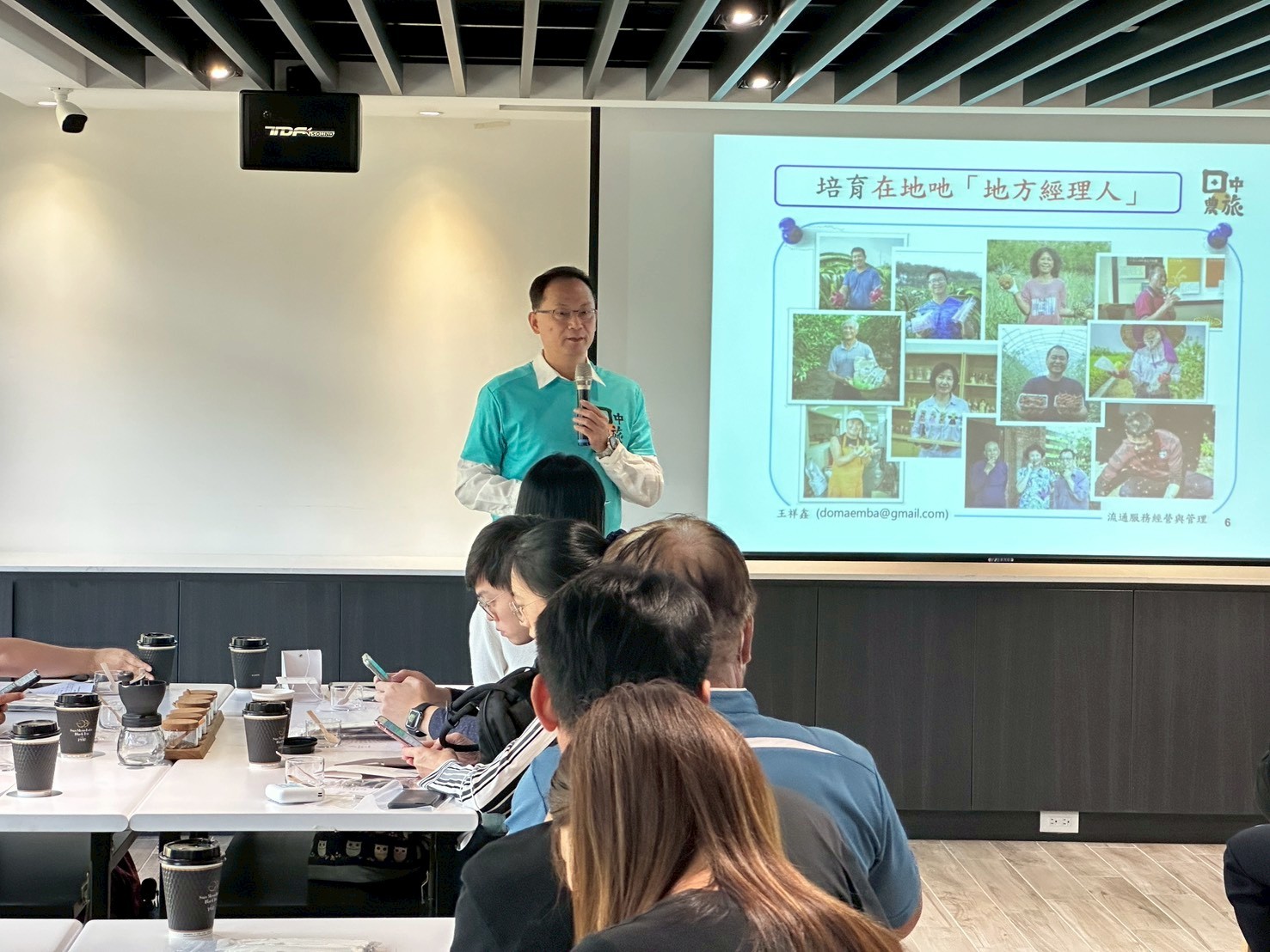 活動首先於魚池鄉農會日月潭紅茶館登場,由東吳大學尤努斯社會企業中心王祥鑫執行長以「農產業六級化經營分享」為題開講。王執行長以多年輔導農企與地方創生的實務經驗,分享田中農旅共學會的案例,指出「六級化」不僅是生產、加工與行銷的串聯,更是一種「地方共生」的經營思維,強調企業需以經營模式創造永續動能。