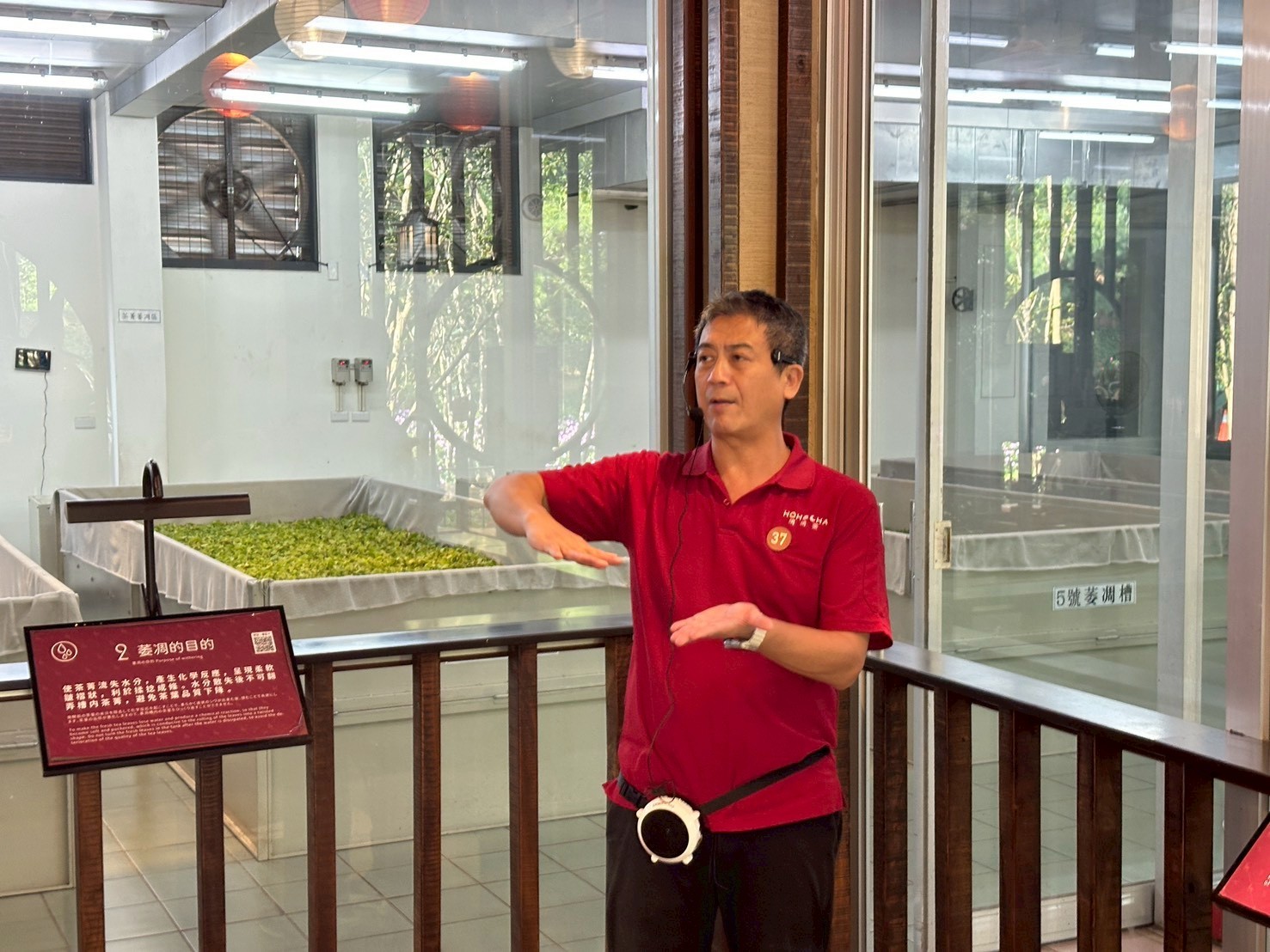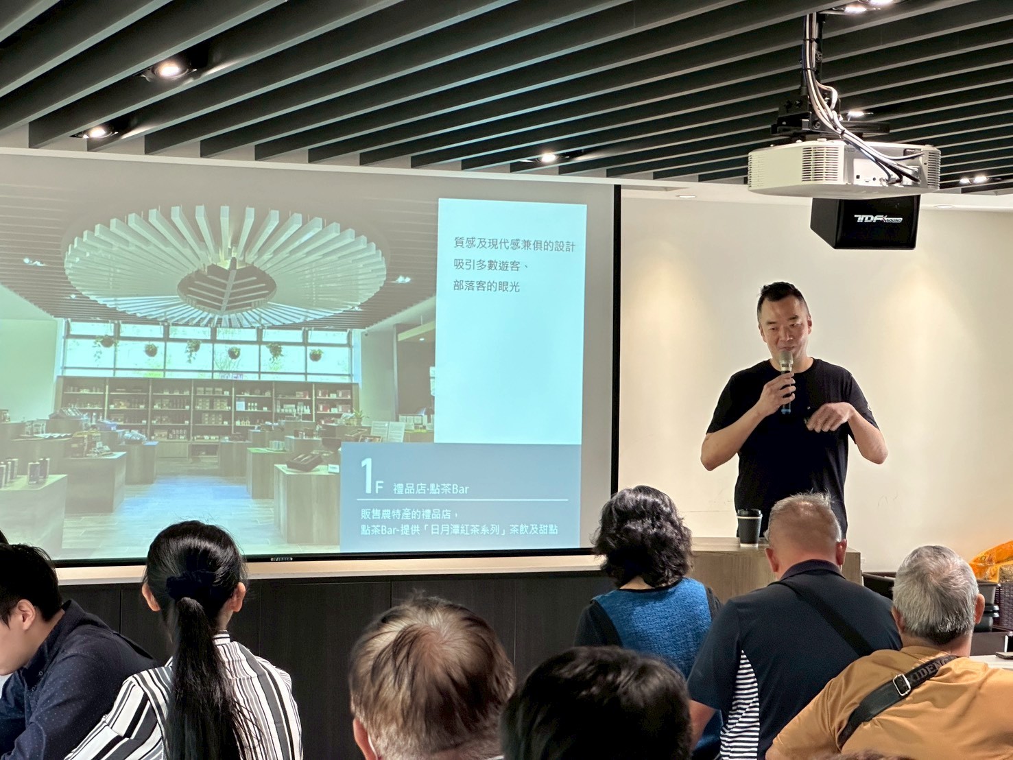 午後行程移至「Hohocha喝喝茶」,由館方導覽人員介紹品牌以「日月潭紅茶」為主軸,結合日式木構空間與茶文化體驗的經營策略。館內設有透明化製茶工廠與品茗體驗區,參訪者透過導覽與品茗,實際感受「場域設計 × 文化故事 × 顧客互動」三者的融合如何強化品牌辨識度。