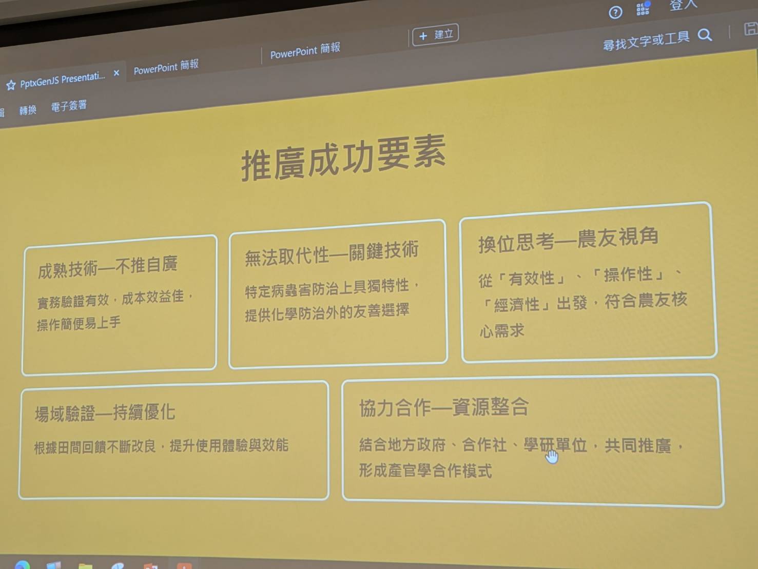 講者剖析技術落地障礙與推廣策略,強調跨域合作與農友、廠商的導向思維。