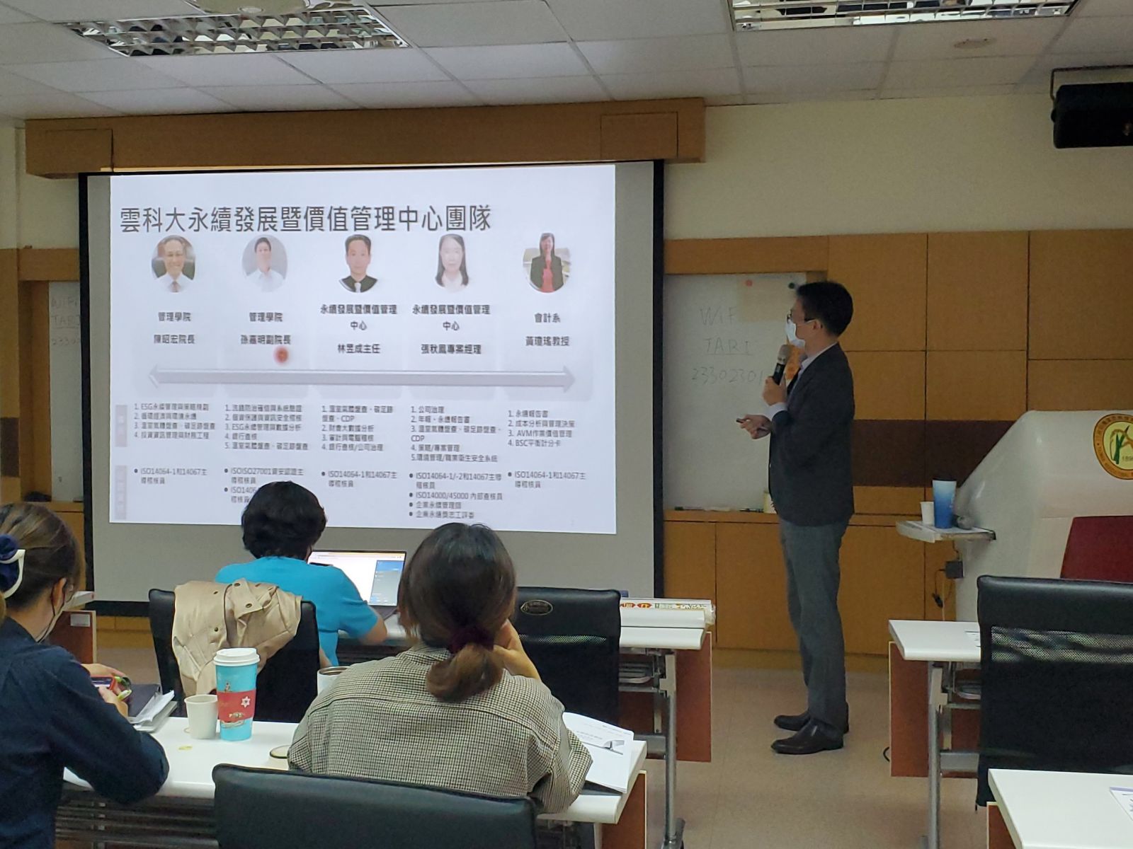 (左)敬邀國家實驗研究院蔡宛栩副研究員講解科技計畫導入OKR概念說明、(右)敬邀雲科大經營與管理研究中心林昱成主任講解農產業ESG永續經營概論