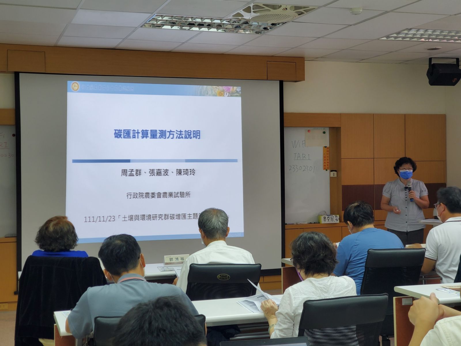 (左)農業試驗所劉滄棽組長為工作坊簡介說明流程、(右)農業試驗所陳琦玲研究員簡介碳匯計算量測方法說明