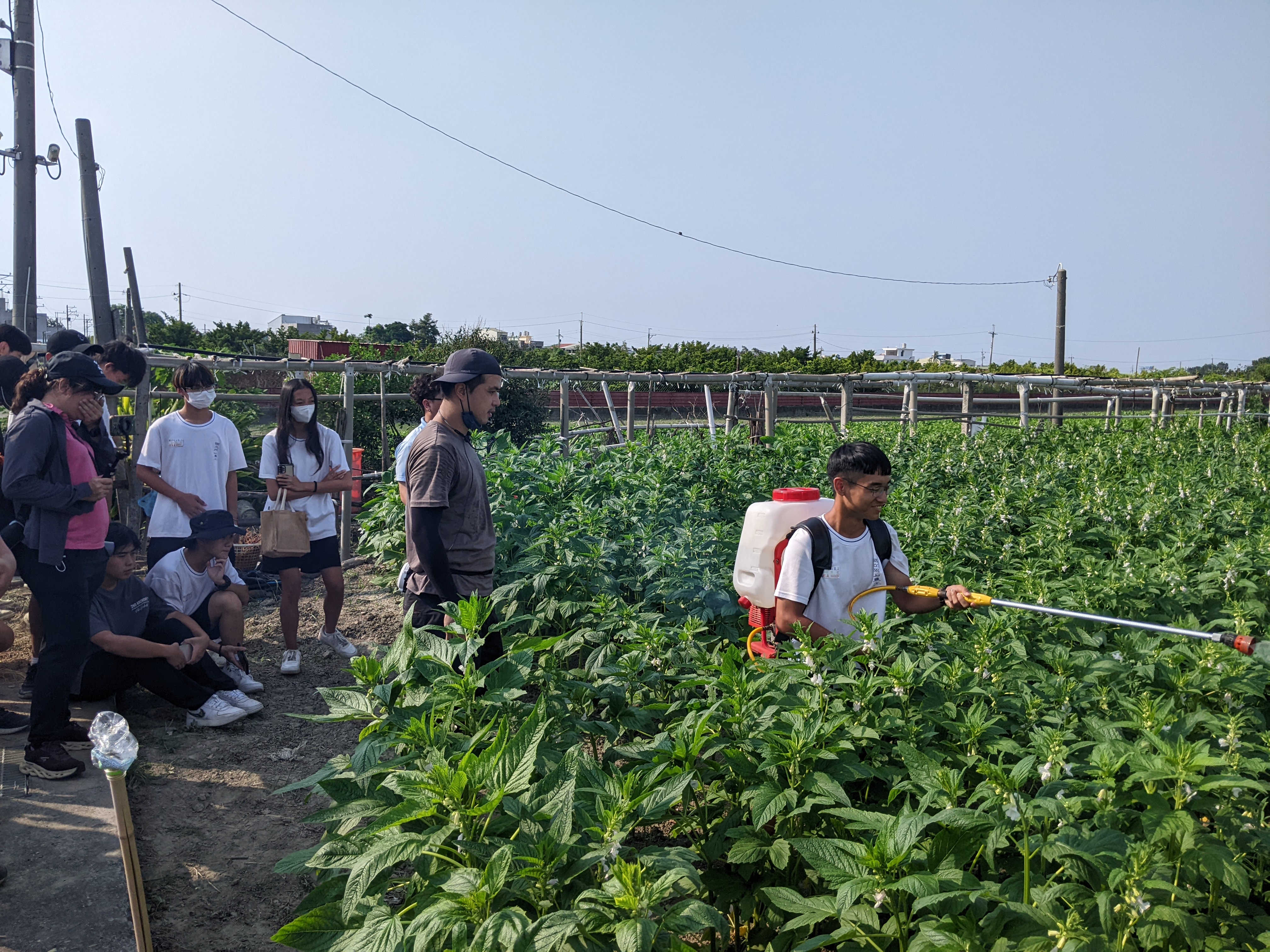 隨後在農會講師帶領下,學生進入胡麻前處理室與榨油廠,觀摩從清洗、焙炒到榨取的各項步驟,認識地方加工流程與品質控制。胡麻田間導覽中,學生實際體驗背負式農藥桶操作,學習防護裝備穿戴與噴灑管理的重要性,感受農業作業的專業與細節。