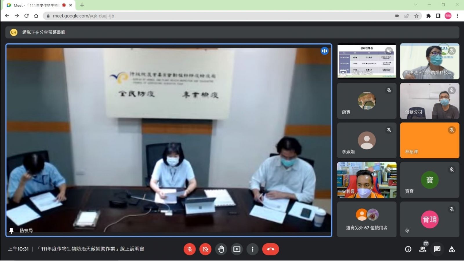 行政院農業委員會於106年宣示化學農藥減半政策,為降低化學農藥使用,近年積極開發生物防治天敵等替代防治技術。基於多數農民對於天敵昆蟲之應用較為陌生且存在成本較高之刻板印象。因此行政院農業委員會防疫檢驗局(以下簡稱防檢局)推動「作物生物防治天敵補助」,補助購買天敵費用1/2,每公頃最高補助一萬元,並委託本學會於9月8日(週四)辦理「作物生物防治天敵補助作業線上說明會」,本次活動共118人出席,參與成員97%來自全省各鄉鎮農會。
