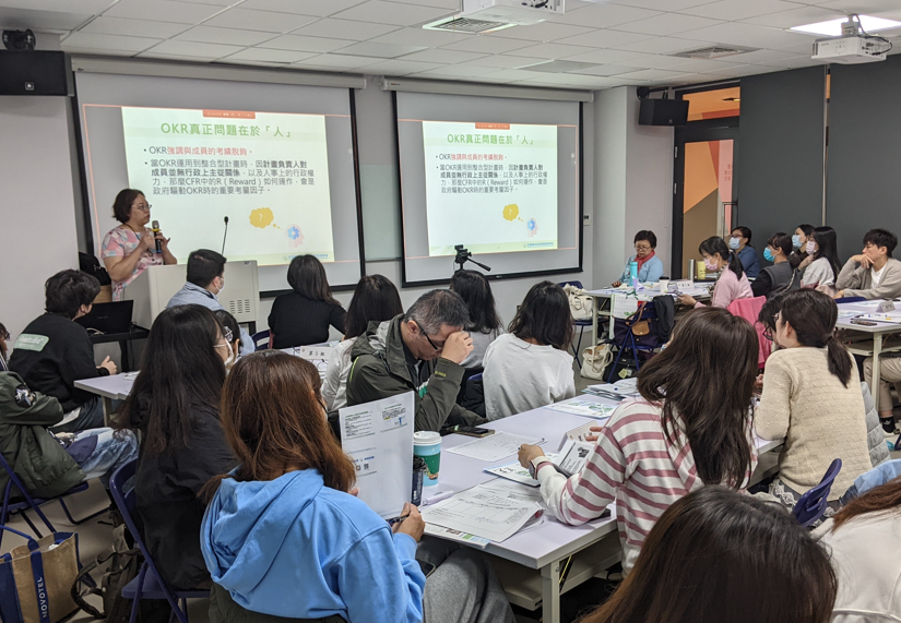 上午課程由本學會李宜映理事長主講,從公部門常見 KPI 設計現況切入,說明 OKR 並非取代既有KPI指標體系,而是補強目標對齊與跨單位溝通的工具。課程一開始導入「我有/我沒有:OKR 互動提問」作為破冰設計,引導學員回應 OKR 推動過程中常見的實務情境,快速彙整第一線的共通感受與操作痛點。
